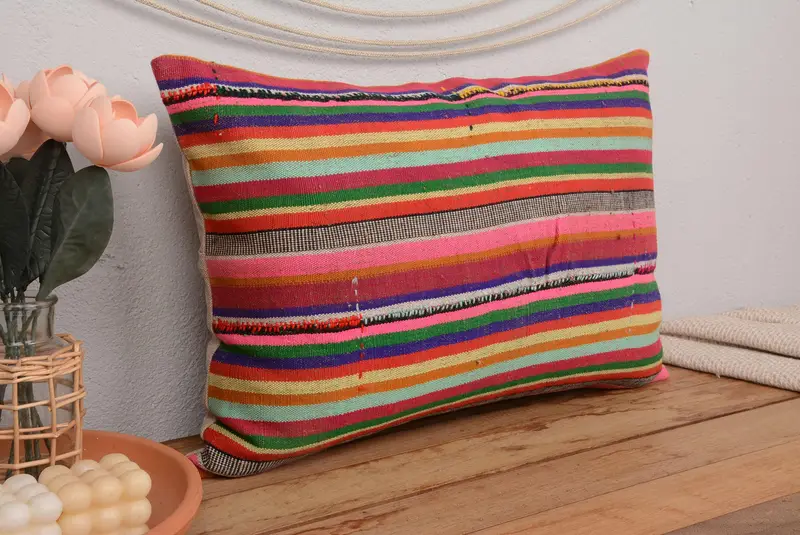 Embroidered Pink & Bronze Striped Pillow, Handmade Vintage Cushion