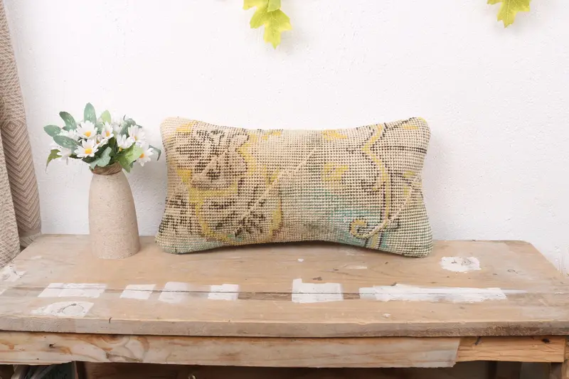 Green & Orange Floral Embroidered Pillow, Vintage Rectangle Throw Pillow