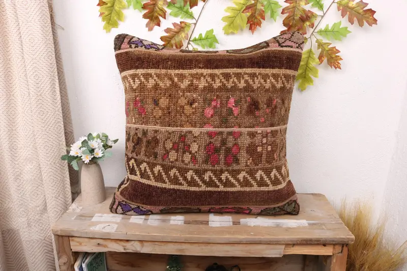 Brown & Pink Patchwork Throw Pillow, 22x22 Embroidered Cushion