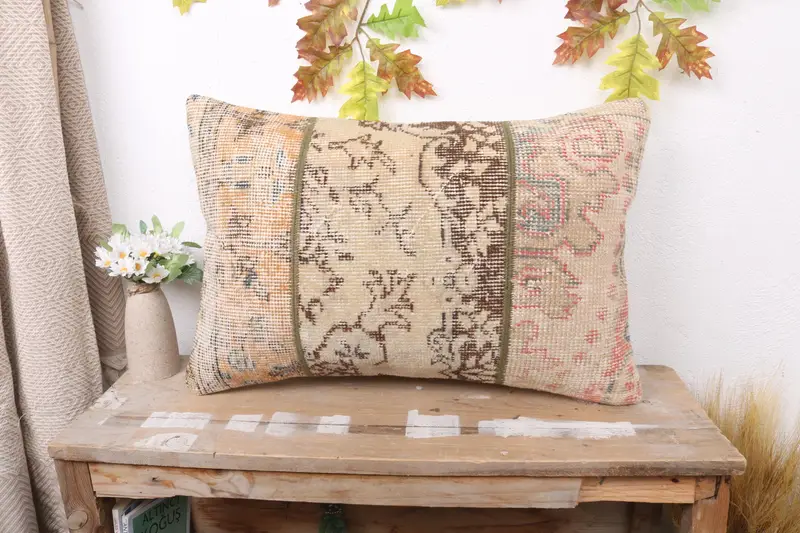 Beige & Brown Patchwork Throw Pillow, 16x24 Embroidered Cushion