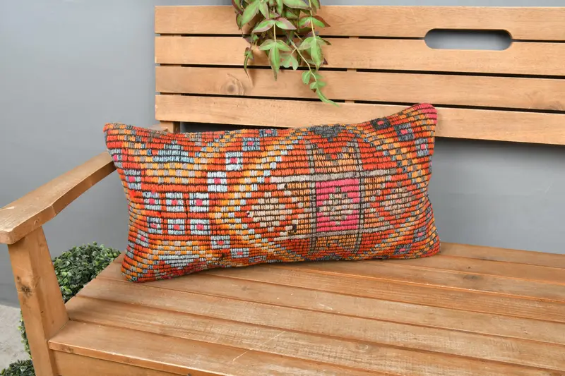 Handmade Orange & Yellow Geometric Throw Pillow, 12x24 Vintage Linen Pillow