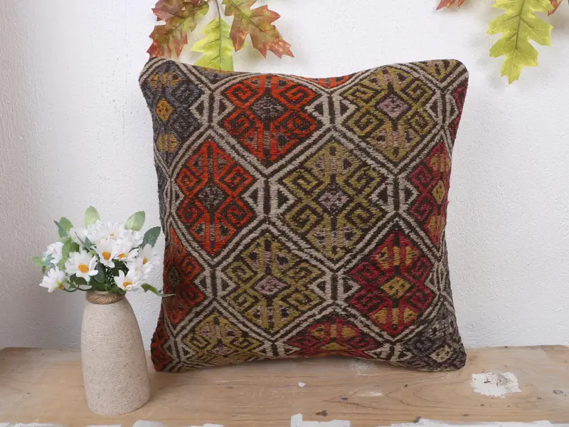 Handcrafted Embroidered Pillow, Green & Red Geometric Throw Pillow