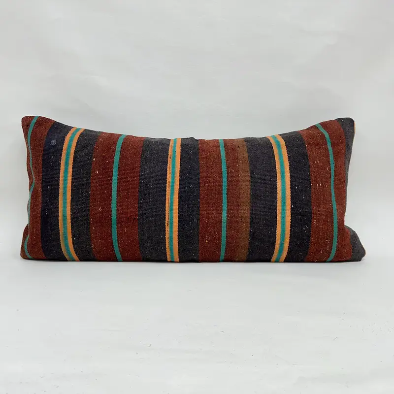 Blue & Brown Striped Throw Pillow, Handmade Embroidered Cushion