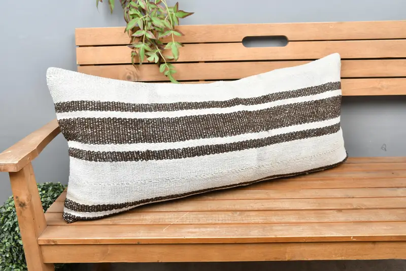Embroidered Striped Pillow, 16x36 Handmade Cushion with Zipper