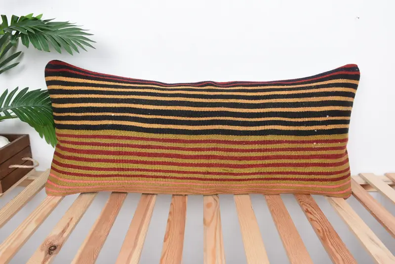 Handmade 16x36 Orange Striped Pillow, Embroidered Throw Pillow