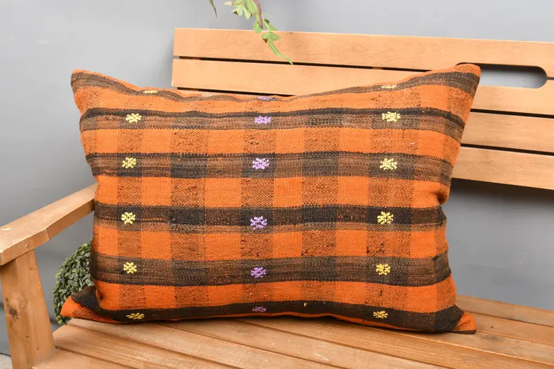 Orange & Brown Striped Throw Pillow, Handmade Embroidered Pillow