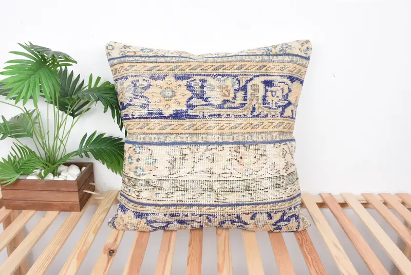 Blue & Orange Embroidered Throw Pillow, 28x28 Handmade Cushion