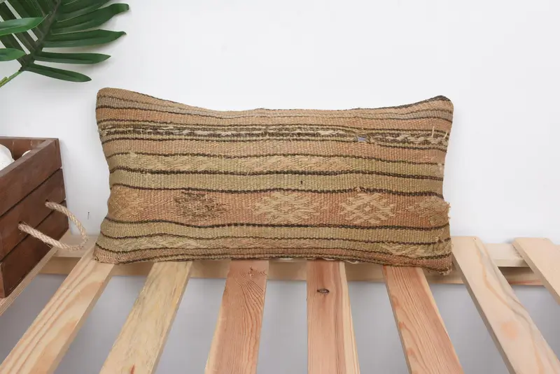 Embroidered Beige Kilim Pillow, 8x16 Handmade Throw Pillow