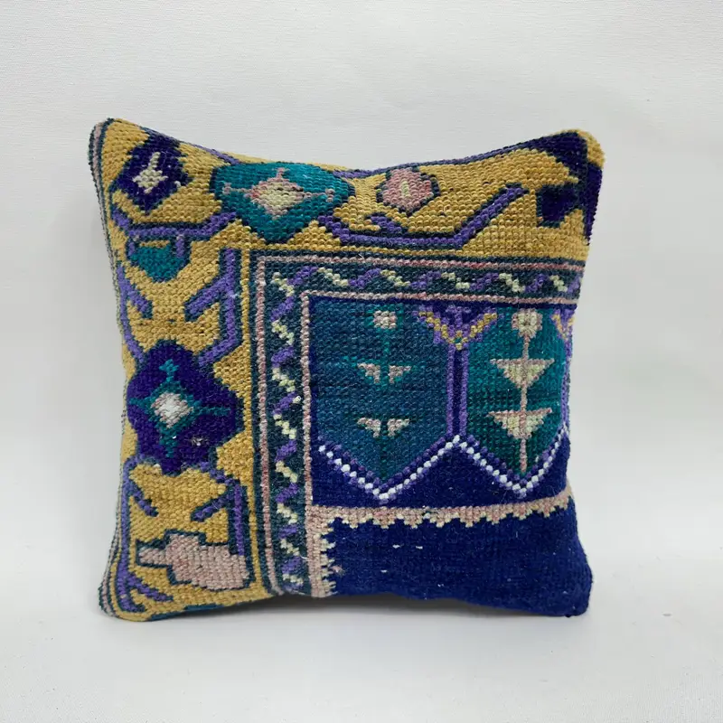Blue & Yellow Embroidered Throw Pillow, 12x12 Vintage Floral Cushion