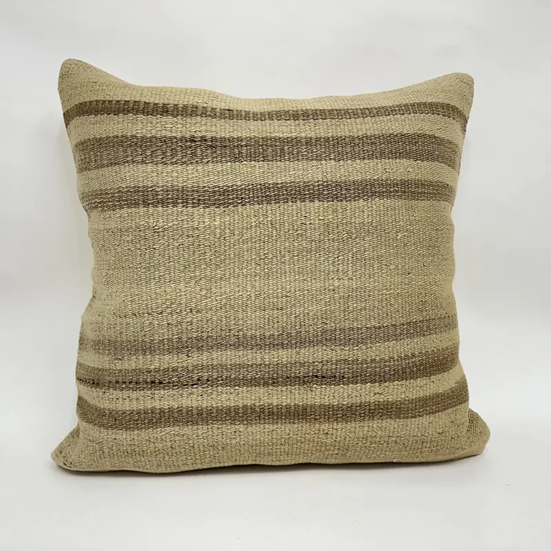 Beige & Brown Striped Throw Pillow, Handmade Embroidered Cushion