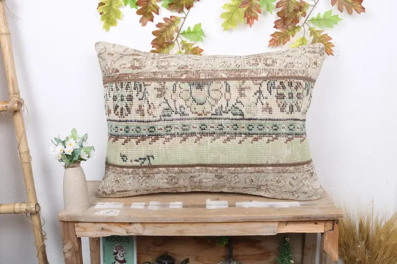 Beige & Green Patchwork Throw Pillow, 20x28 Handmade Linen Pillow