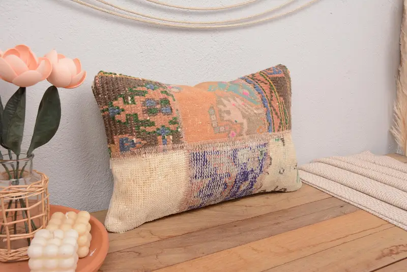 Orange & Green Patchwork Throw Pillow, 12x20 Handmade Cushion