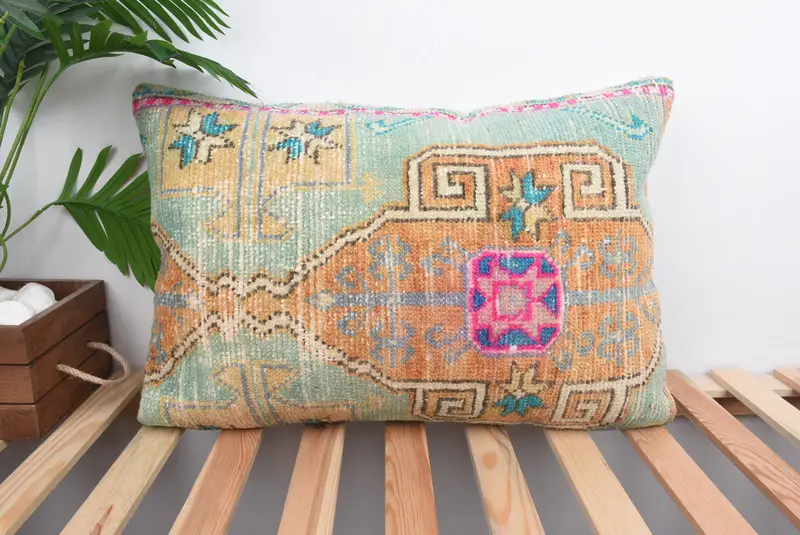 Orange & Green Striped Throw Pillow, Handmade Embroidered Cushion