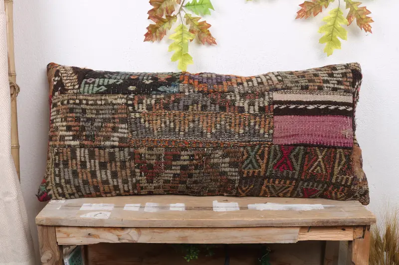 Pink & Brown Patchwork Throw Pillow, Handmade Embroidered Pillow