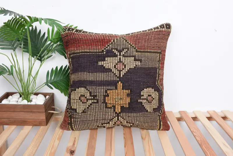 Embroidered Red & Purple Throw Pillow, 24x24 Handmade Cushion