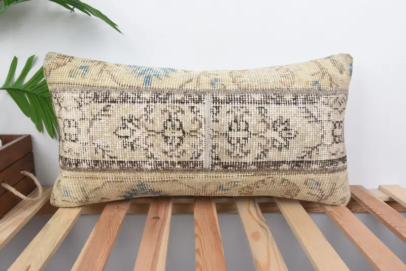 Beige & Brown Embroidered Throw Pillow, Handmade Patchwork Pillow