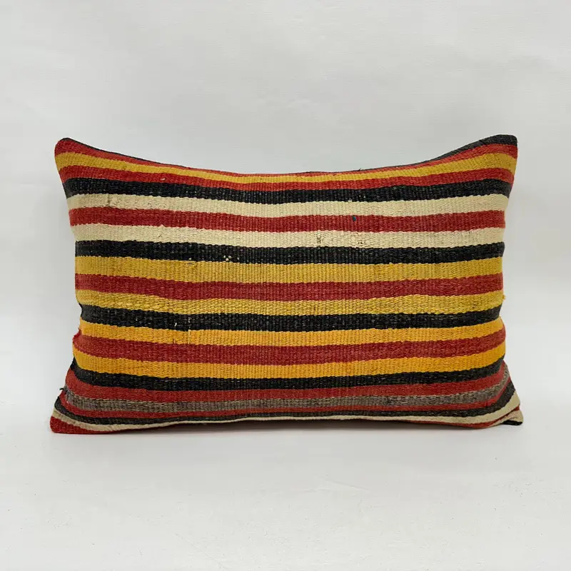 Red & Yellow Striped Throw Pillow, Handmade Embroidered Linen Pillow
