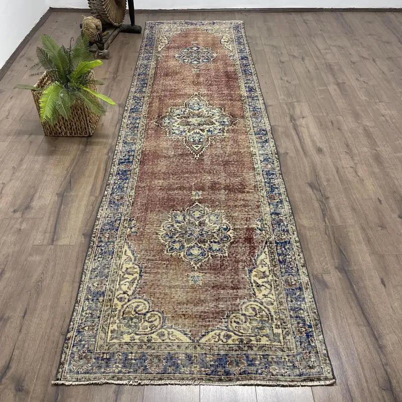 Red Southwestern Rug, 3,1x11,7 ft with Blue Accents