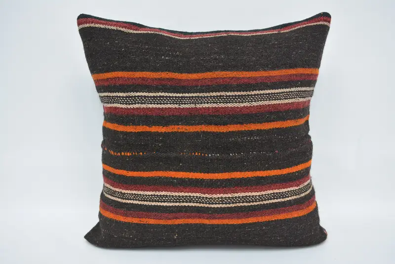 Brown & Orange Striped Throw Pillow, Handmade Hemp & Wool Pillow