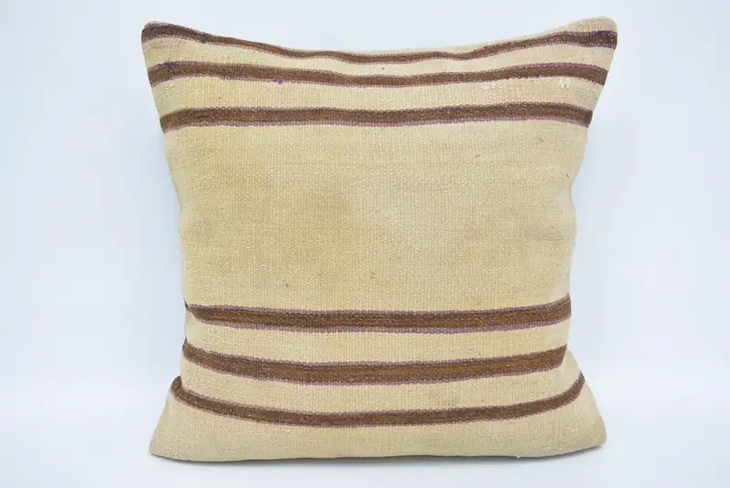 Beige & Brown Striped Throw Pillow, Handmade Embroidered Cushion