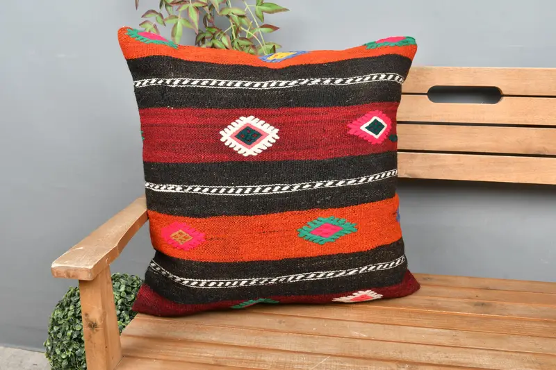 Red & Orange Embroidered Geometric Throw Pillow, Handmade Linen Pillow