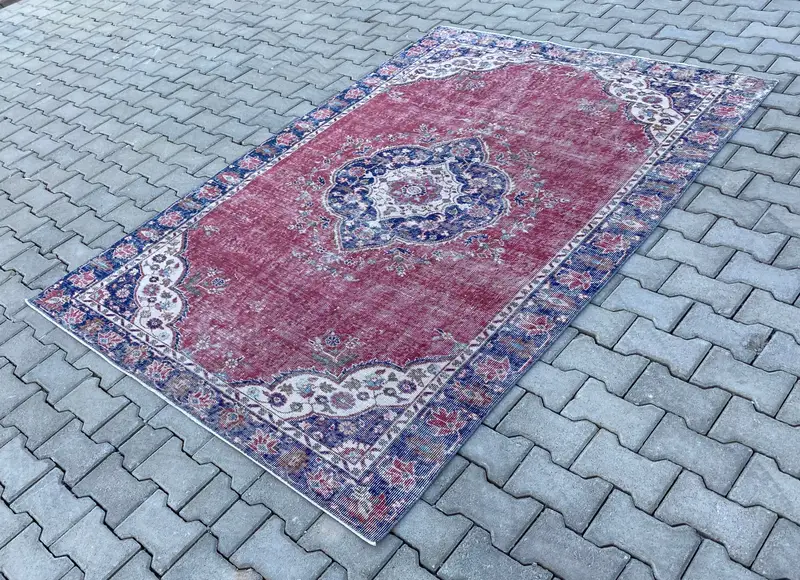 Red and Blue Rug, 5.2x8.5 ft Floral and Geometric Design