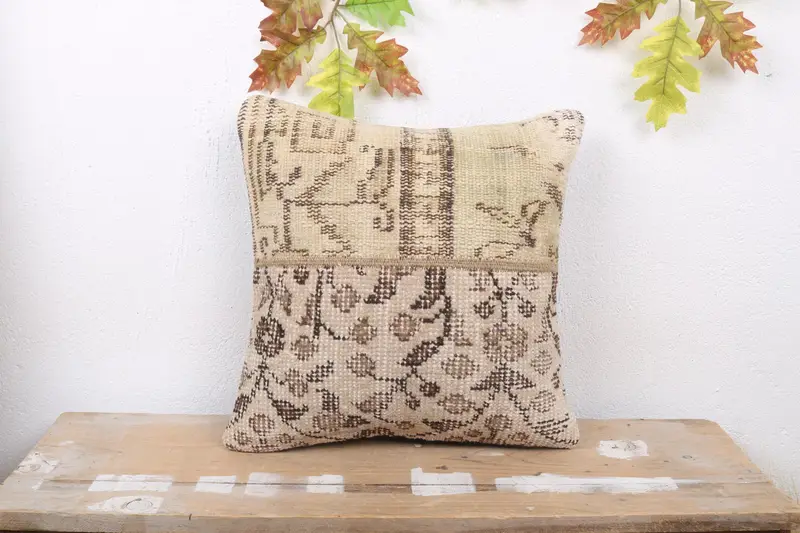 Beige & Brown Patchwork Throw Pillow, Handmade Embroidered Pillow