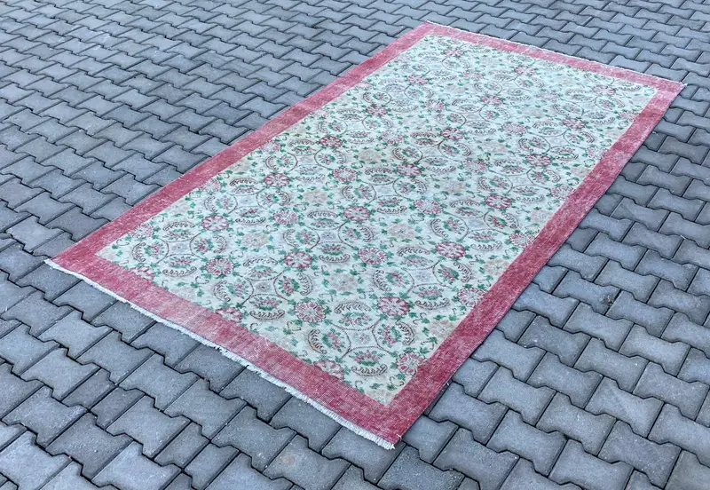 Red and Green Rug, 5,3x8,9 ft Floral and Geometric