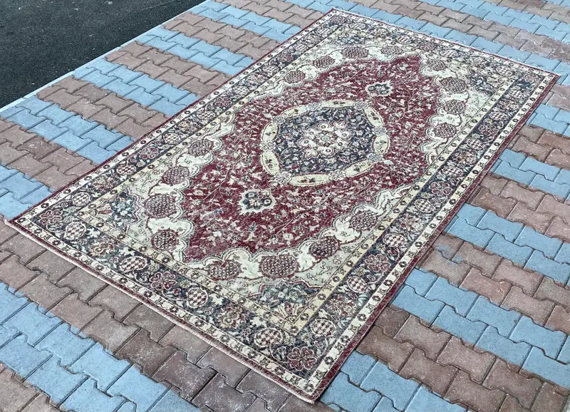 Red & Beige Rug, 5,9x9,7 ft Floral & Geometric Design