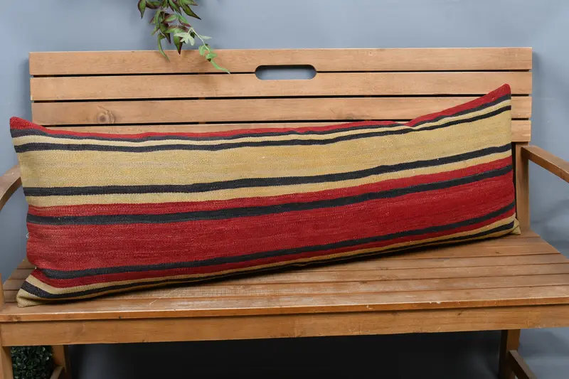 Red & Yellow Striped Throw Pillow, 16x48 Embroidered Cushion
