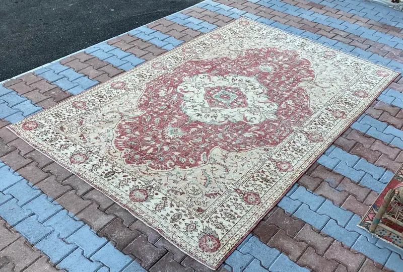 Elegant Pink & Beige Rug, 6.4x9.8 ft Floral & Geometric