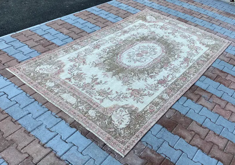 Elegant Beige & Pink Rug, 6x9.5 ft Floral & Geometric