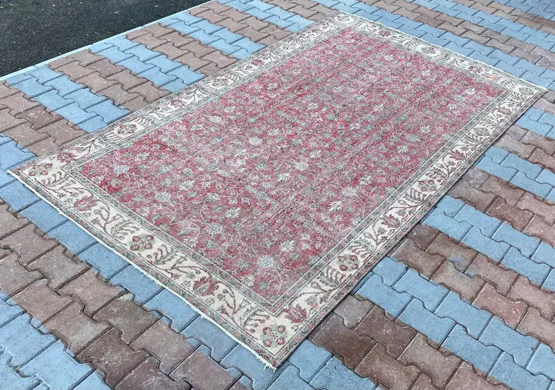 Red and Blue Rug, 5.5x9 ft Floral and Geometric Design
