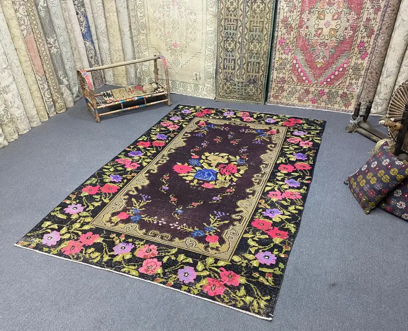 Elegant 5,2x7,8 ft Rug, Black & Pink Floral-Geometric Design
