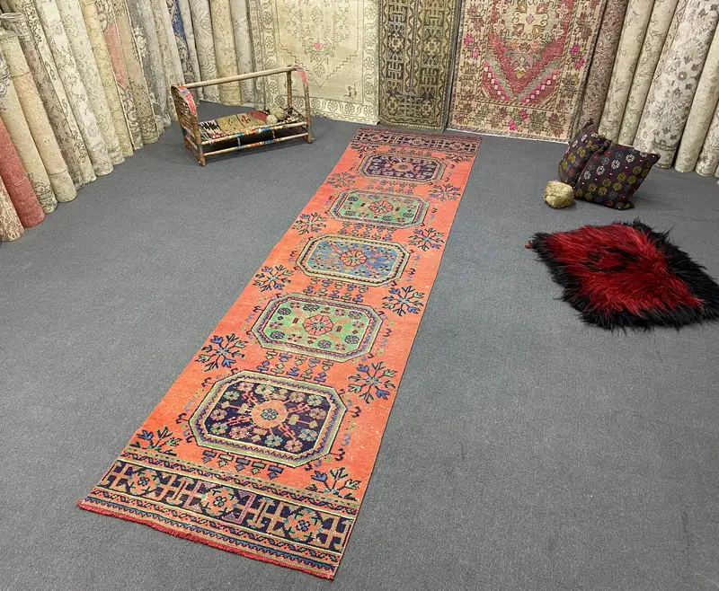 Red and Blue Rug, 2,9x11,5 ft Floral and Geometric