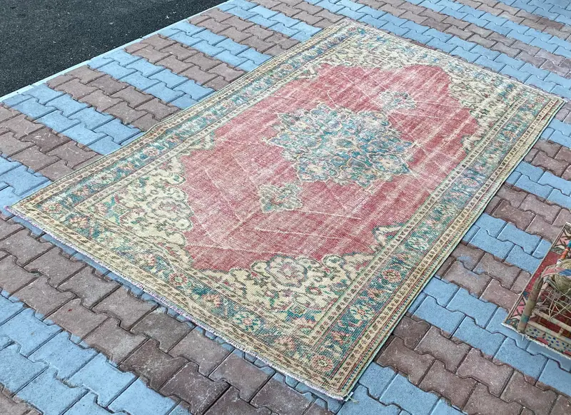 Red and Blue Rug, 6,1x9,1 ft Floral and Geometric Design