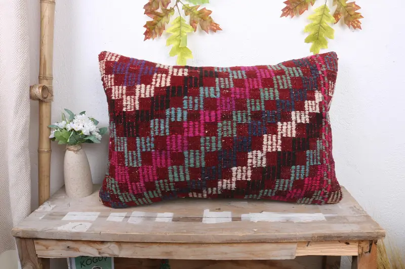 Pink Geometric Throw Pillow, 16x24 Embroidered Cushion with Zipper