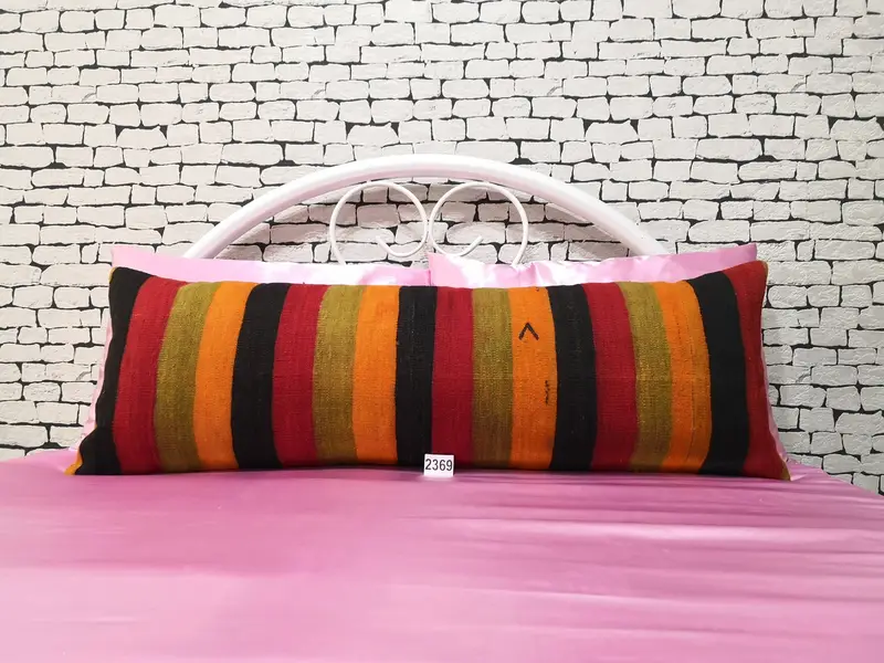 Handmade Striped Wool Throw Pillow, Vintage Embroidered Rectangle Pillow