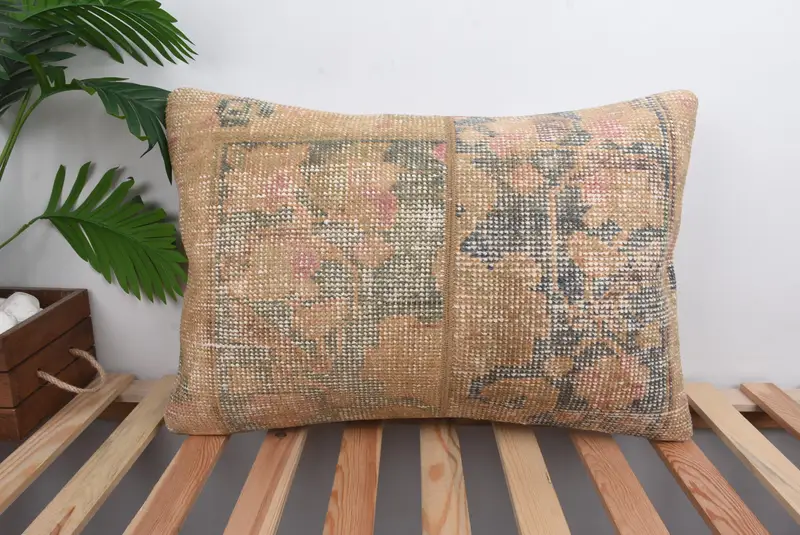 Handmade Embroidered Pillow, Beige & Green Patchwork Throw Pillow