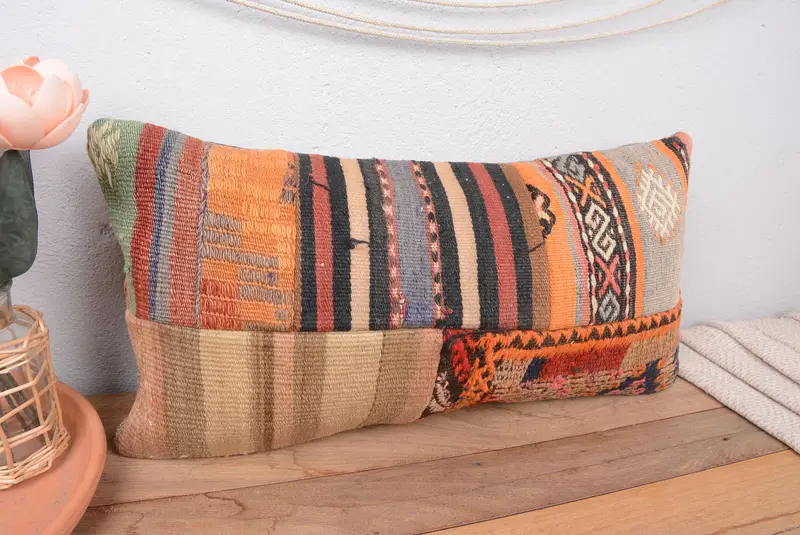 Orange & Beige Patchwork Throw Pillow, Handmade Rectangular Pillow