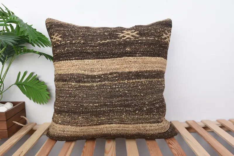 Brown & Beige Striped Throw Pillow, Embroidered Vintage Cushion