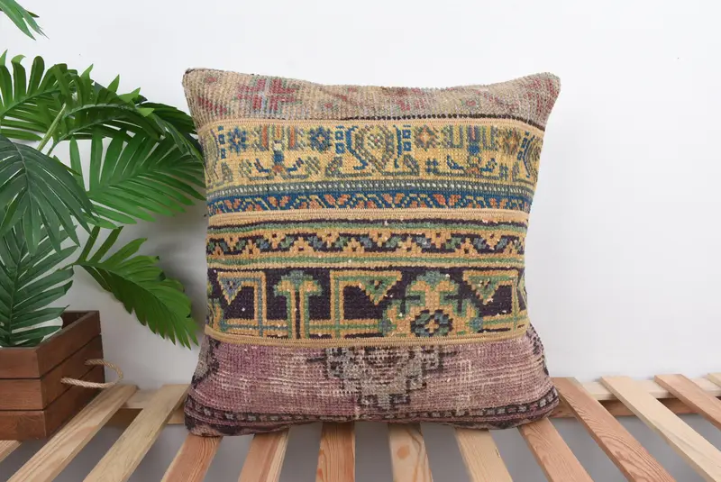 Blue & Orange Patchwork Throw Pillow, Handmade Embroidered Cushion