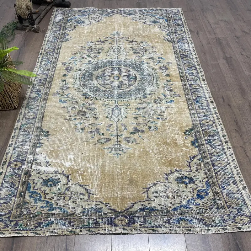 Yellow Moroccan Rug, 4,9x8,4 ft Blue Accents