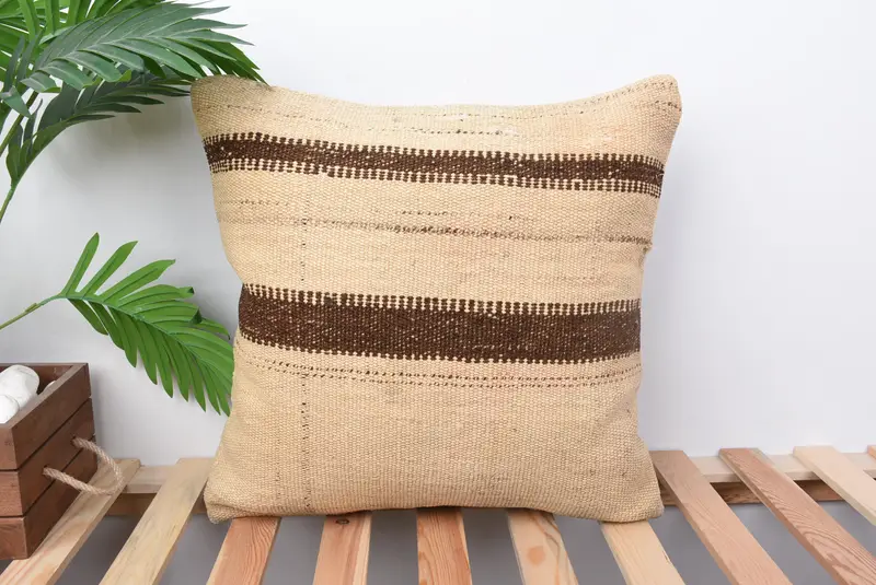Beige & Brown Striped Throw Pillow, Vintage Embroidered Cushion