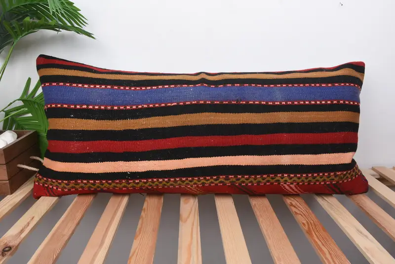 Brown & Red Striped Pillow, Embroidered Vintage Throw Pillow