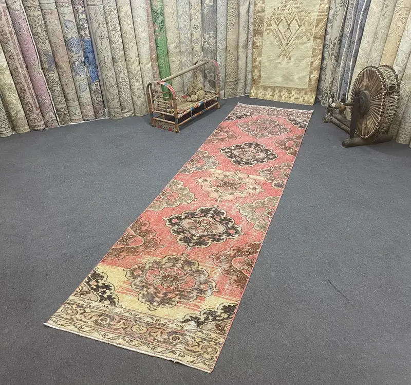 Elegant Pink & Beige Rug, 3x11.5 ft Floral & Geometric