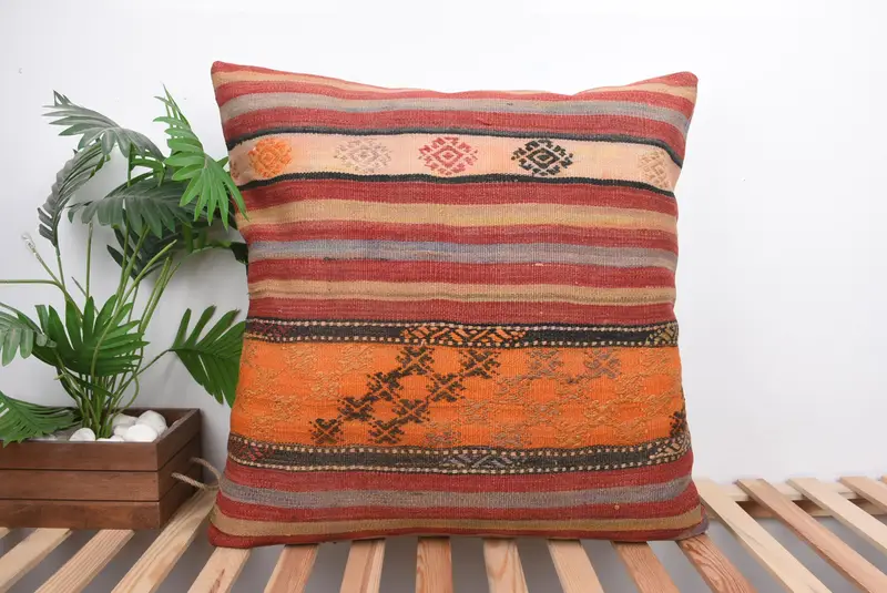 Red & Orange Striped Throw Pillow, Embroidered Vintage Cushion