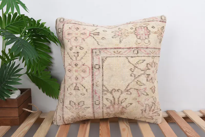 Handcrafted Beige & Brown Floral Throw Pillow, Vintage Linen Pillow