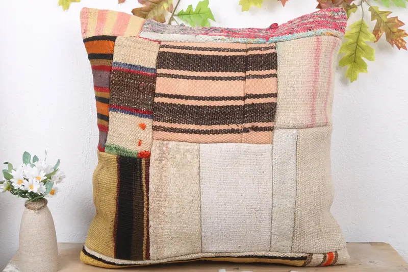 Beige & Brown Patchwork Throw Pillow, Handmade Embroidered Pillow