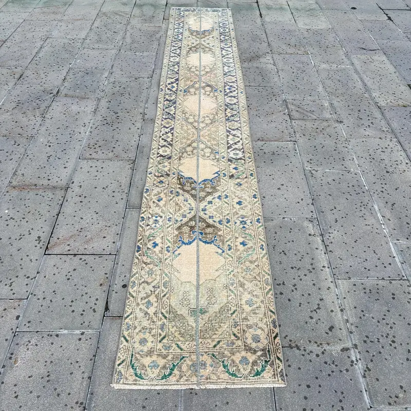 1,9x11,9 ft Beige Rug, Blue Floral & Paisley Design